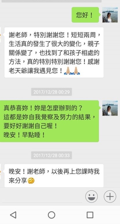 2017年底的某個半夜,接到老長官的電話,說對岸有位上過我的課的學員,急著要加我微信,有急事!半夜的急事,當然速速接通。下圖是接通後的對話,幸好這急事是喜訊,一位開始換位思考的媽媽,急著和我分享有效策略底下,幸福的親子關係......